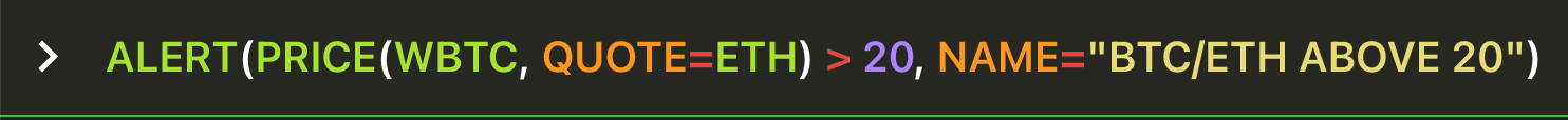 Timing your entry point? Using the PRICE function with an optional QUOTE override, we can set up an alert for when 1 WBTC is worth 20 ETH: