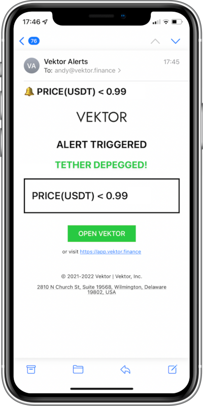 The above example is probably the simplest, but once you get used to Vektor Execution Language (VXL) for writing formulaic alerts, you'll see that there are many different use cases. The selection below suggests some examples for trading, lend/borrow, risk management, portfolio management and more! Â