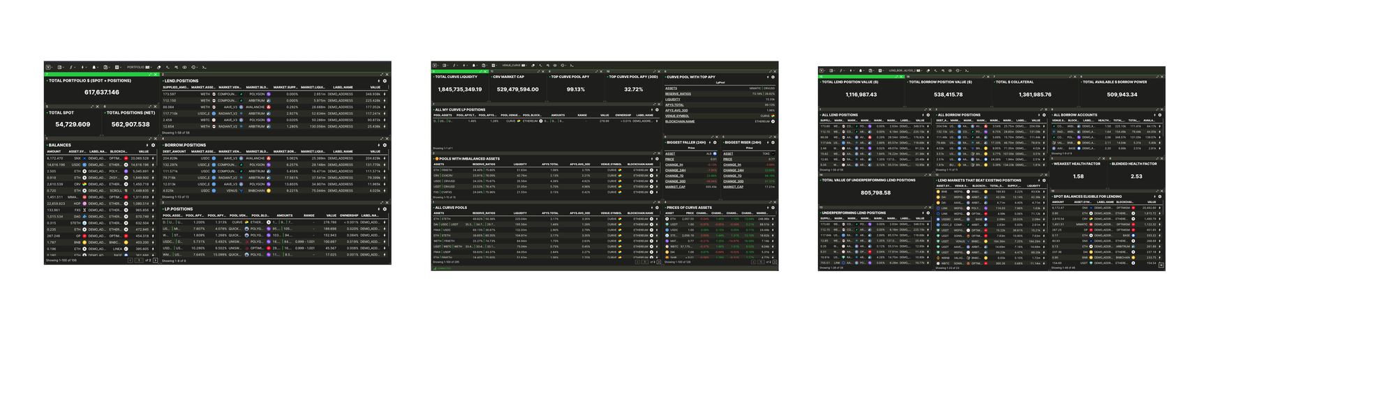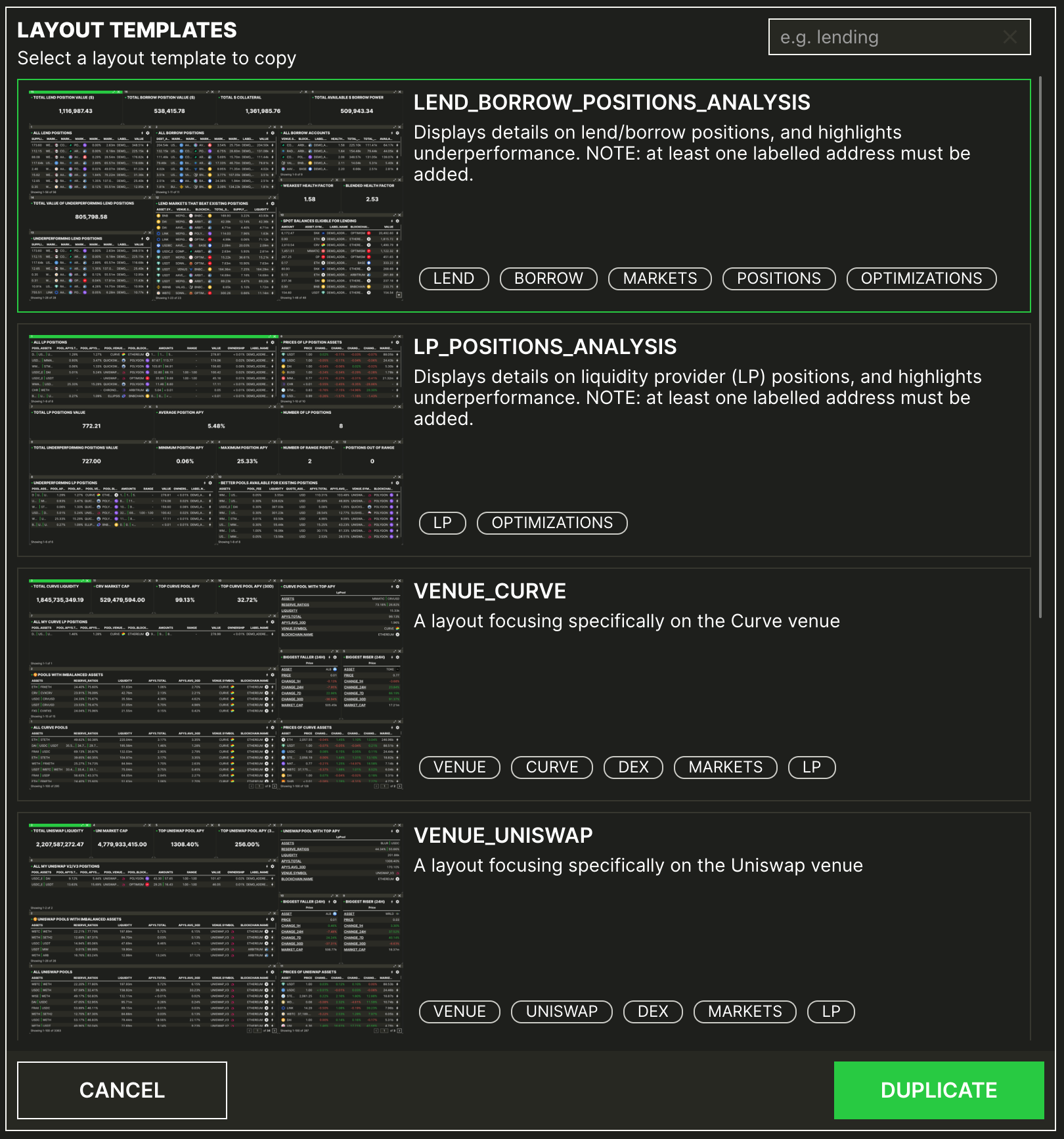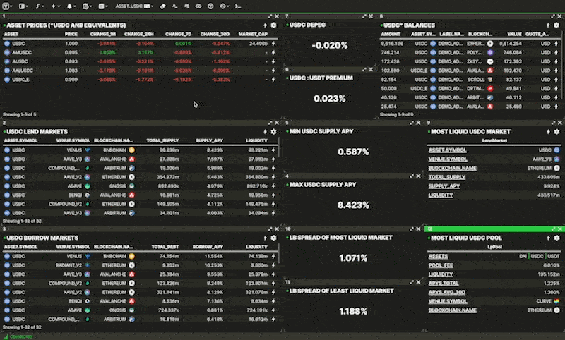 LEND BORROW POSITIONS ANALYSISdisplays various analytics on your lend/borrow positions, and highlights underperforming positions.LP POSITIONS ANALYSISdisplays various analytics on your liquidity provider (LP) positions, and highlights underperforming positions.VENUE CURVE / UNISWAP / AERODROMElayouts focus specifically on these specific venues, with specialised queries and components providing deep analytics.PORTFOLIOis a high level global view of all your multichain balances and positions.USDClayouts focuses specifically on the USDC asset including liquidity, price, risk, and spread metrics (and more)