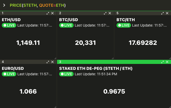 Have custom requirements for monitoring prices? Use PRICE to create your own price dashboard with full control over what assets you show, what they are quoted in, or where they are positioned.