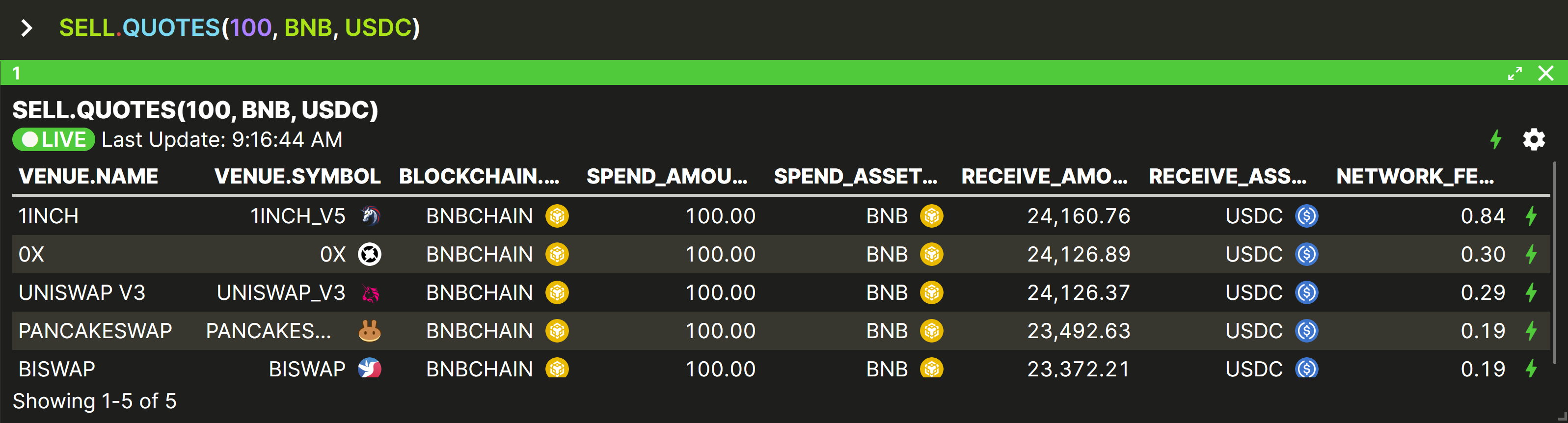 Looking for a good trade entry point? Use QUOTES to produce a table of buy/sell prices across multiple blockchains and/or venues, and watch them update! Then use BUY or SELL to execute.
