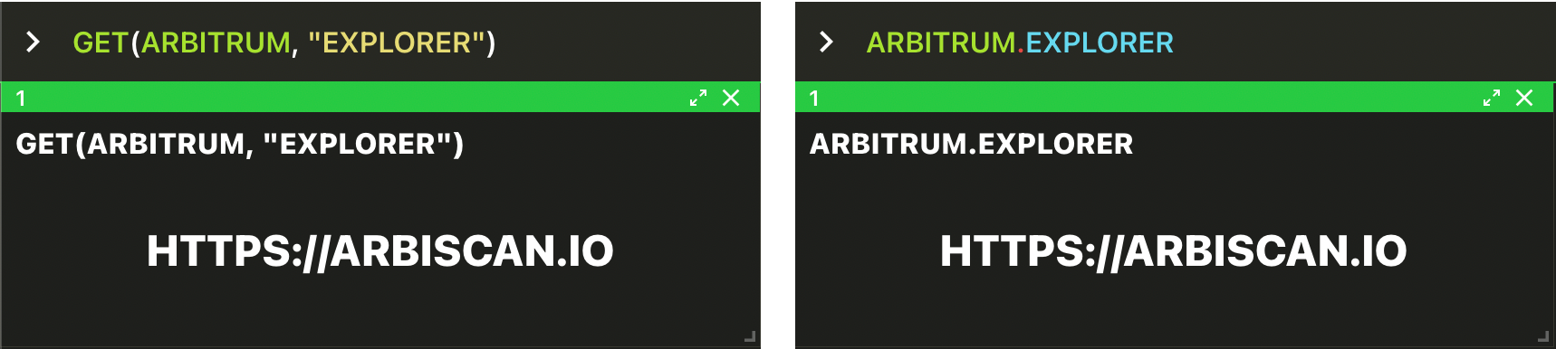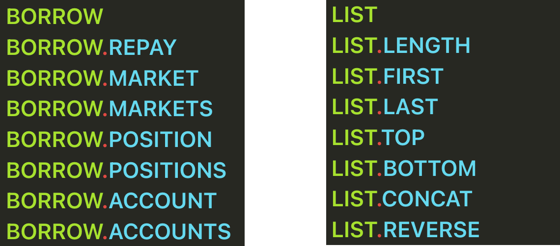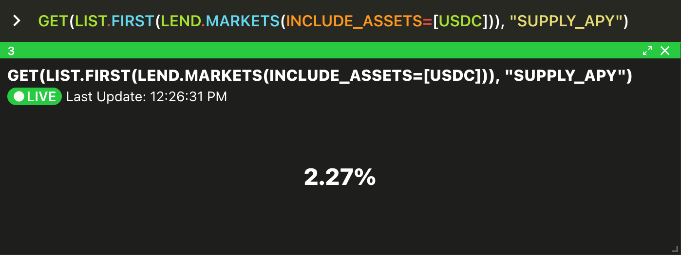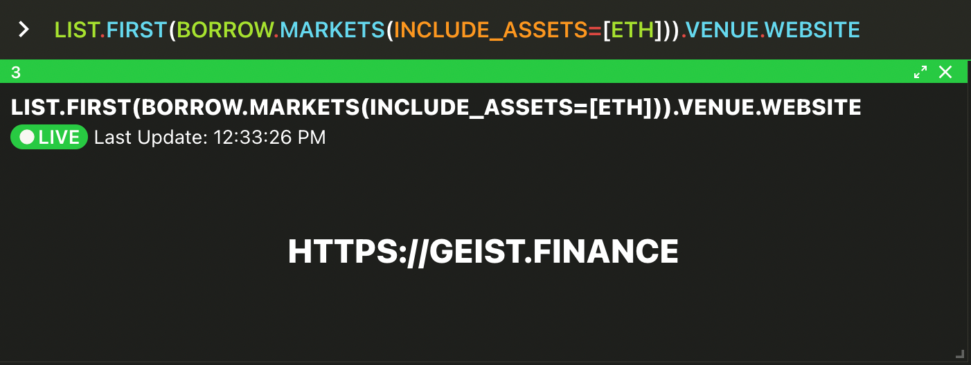 GET function would be GET(LIST.FIRST(BORROW.MARKETS(INCLUDE_ASSETS=[ETH])), ["VENUE", "WEBSITE"])Depending on your use case, you may be passing objects directly as function arguments e.g.