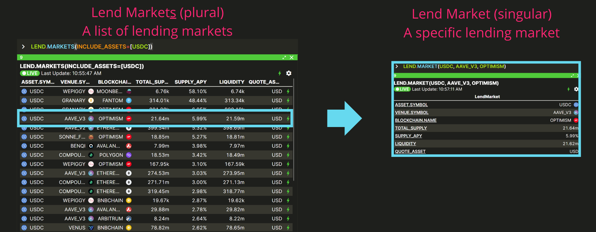 which can be used with BALANCES, LEND.MARKETS, LEND.POSITIONS, BORROW.MARKETS, BORROW.POSITIONS, BORROW.ACCOUNTS, BUY.QUOTES, SELL.QUOTES, LP.POOLS, LP.POSITIONS, PRICES, ASSETS and many more!